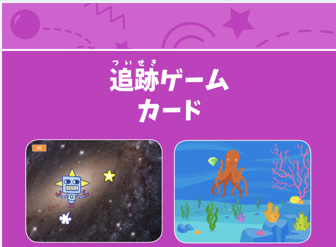 プログラミング体験学習スクラッチのコーディングカードの中でも人気の2つを体験していただきます。初心者にも分かりやすいプロジェクトです。体験1回目「追跡ゲーム」 ![]() 体験2回目「キャッチゲーム」